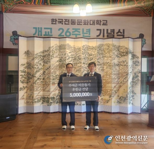 [인천광역신문] 최예준 기자 | 한국전통문화대학교 교직원일동은 개교 26주년 기념행사에서 저소득 가구의 초·중·고 학생 장학금으로 사용해 달라며 이웃돕기 성금 500만 원을 부여군에 기탁했다고 22일 밝혔다.