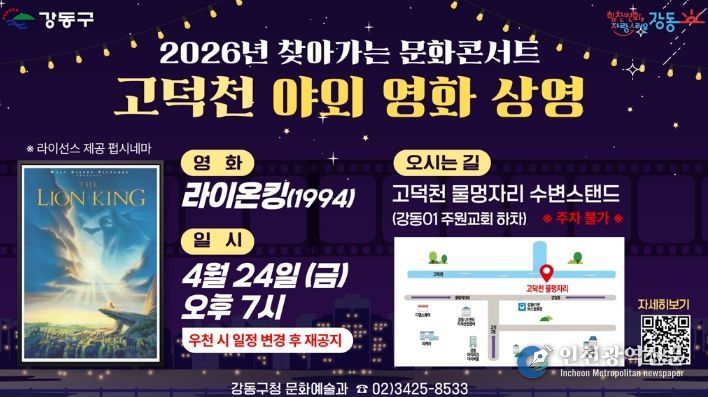 [인천광역신문] 최예준 기자 | 서울 강동구는 오는 24일 오후 7시, 고덕천 물멍자리 수변스탠드(주원교회 맞은편)에서 ‘2026년 찾아가는 문화콘서트’ 3회차 프로그램으로 미디어파사드를 활용한 야외 영화 상영을 진행한다고 밝혔다.