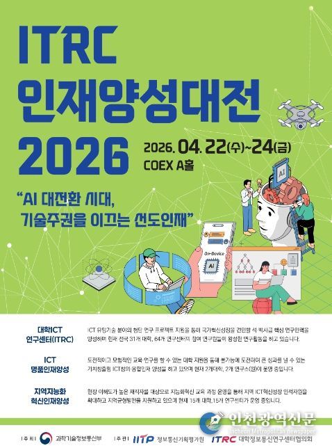 [인천광역신문] 최예준 기자 | 과학기술정보통신부는 4월 22일부터 4월 24일까지 3일간 국가 AI·ICT R&D 우수성과물 홍보 및사업화 기회를 제공하기 위한 '2026 정보통신(‘ICT’) 기술사업화 페스티벌'과 대학의 석박사급 인재양성 연구·교육 성과 교류·확산을 위한 '2026 ITRC 인재양성대전'을 서울 삼성동 코엑스에서 개최한다.