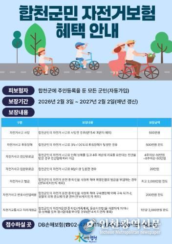 [인천광역신문] 최예준 기자 | 합천군은 군민들의 자전거 이용 활성화와 안전사고에 대비하기 위해 ‘2026년 합천군민 자전거 단체보험’에 가입했다고 22일 밝혔다.