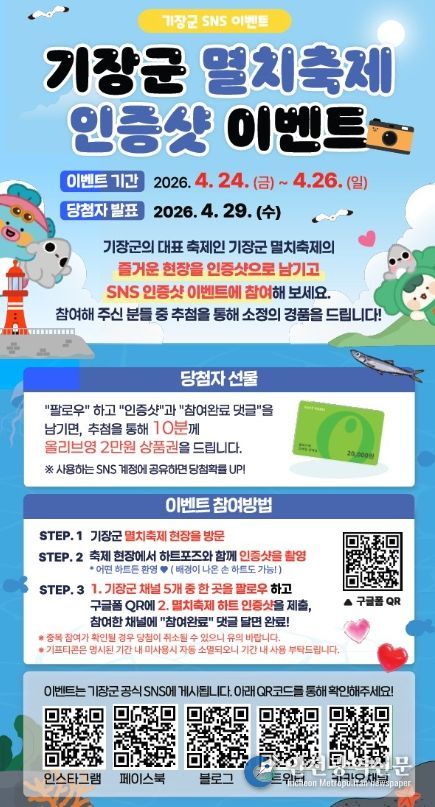 이번 이벤트는 기장군을 대표하는 축제인 기장멸치축제를 찾는 관광객들이 보다 즐겁게 축제를 체험하고, 기장군 공식 SNS 채널을 통해 군정 소식을 보다 친근하게 접할 수 있도록 기획됐다.