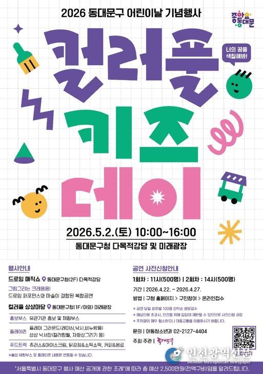 먼저 어린이날을 기념해 5월 2일 동대문구청 2층 다목적강당 및 1층 미래광장에서 2026년 어린이날 기념행사 '컬러풀 키즈데이'를 개최한다.