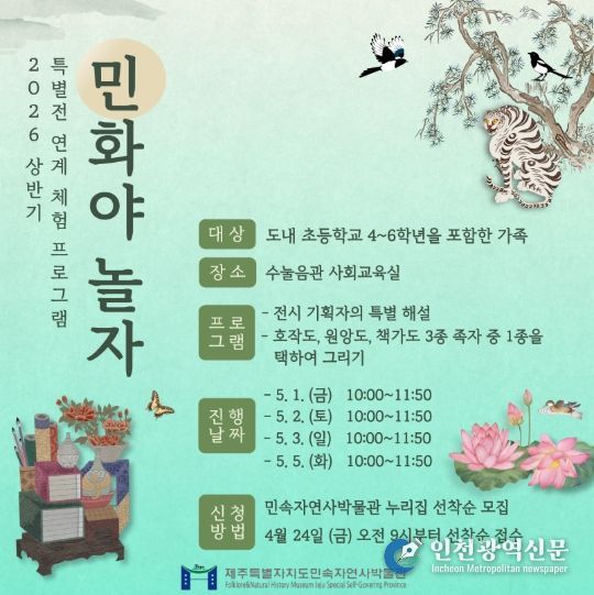[인천광역신문] 최예준 기자 | 제주특별자치도 민속자연사박물관(관장 박찬식)이 5월 연휴 기간 민화 체험 프로그램 ‘민화야 놀자'를 운영한다.