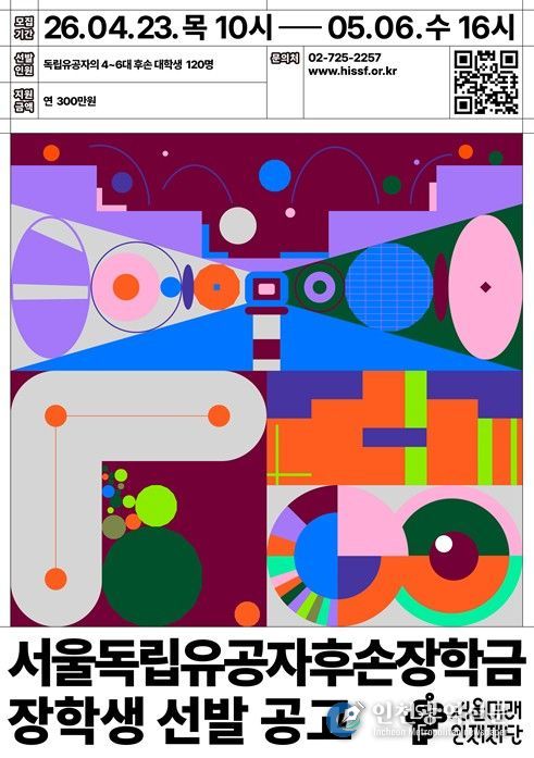 [인천광역신문] 최예준 기자 | 서울미래인재재단은 독립유공자(순국선열‧애국지사)의 증손자녀 이하 4~6대 후손 120명을 선발해 1인당 연 300만 원(150만 원 2회 분할 지급)씩 총 3억 6천만 원 규모의 장학금을 지원하는 ‘서울독립유공자후손장학사업’을 추진한다.