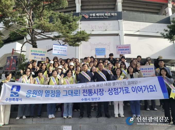 [인천광역신문] 최예준 기자 | 수원시 장안구는 지난 22일, 수원KT위즈파크 일대에서 야구관중을 대상으로 지역경제 활성화를 위한 캠페인을 추진했다. 이번 캠페인에는 장안구청장을 비롯해 관계 공무원과 물가모니터요원 등 20여 명이 참여했다.