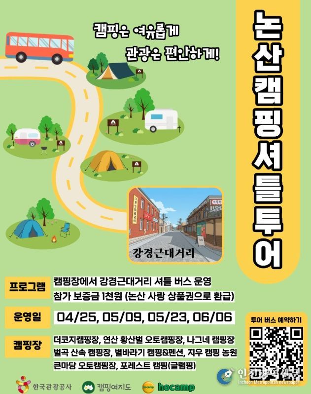 [인천광역신문] 최예준 기자 | 논산시는 4월 25일부터 강경근대거리의 관광 매력을 널리 알리고 체류형 관광 활성화를 위해 ‘논산 캠핑 셔틀버스’ 프로그램을 운영한다.