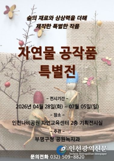 [인천광역신문] 최예준 기자 | 부평구는 부평숲 인천나비공원에서 오는 28일부터 ‘자연물 공작품 특별전’을 개최한다고 밝혔다.