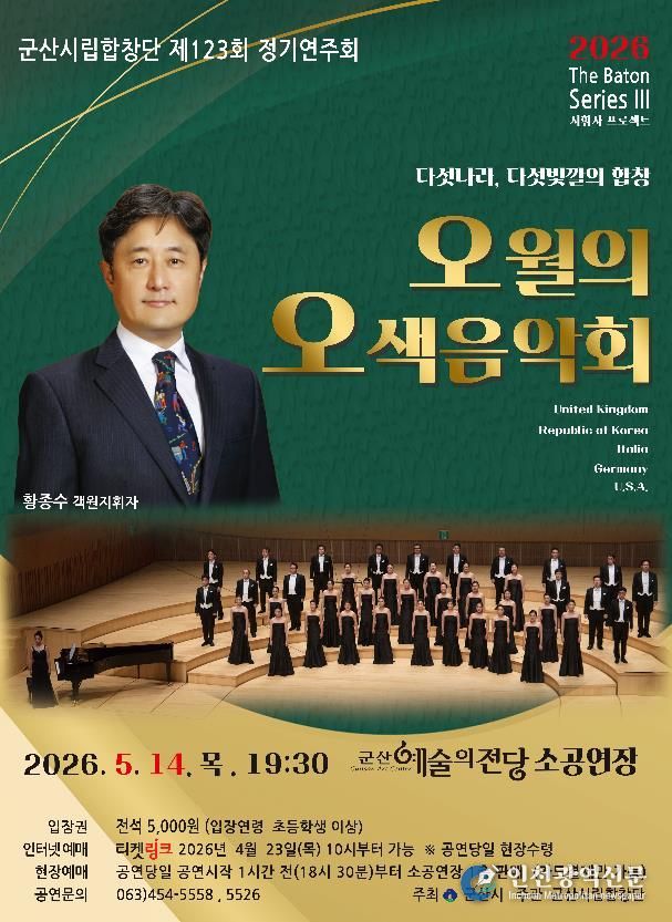 [인천광역신문] 최예준 기자 | 군산시립합창단이 오는 5월 14일 오후 7시 30분, 군산예술의전당 소공연장에서 제123회 정기연주회 ‘오월의 오색음악회’를 개최한다.
