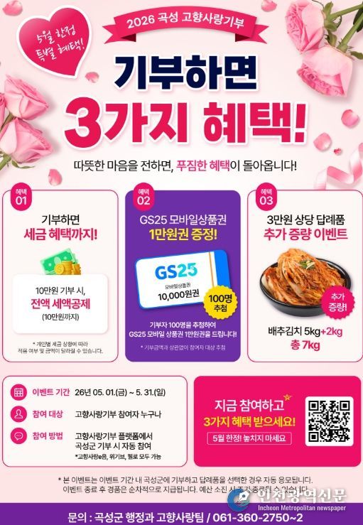 5월 한 달간 인기 답례품을 증량 제공하고, 기간 내 기부자 중 무작위 100명을 추첨해 GS25 1만원권 모바일 상품권을 증정하는 등 다양한 혜택으로 기부 참여를 독려할 예정이다.