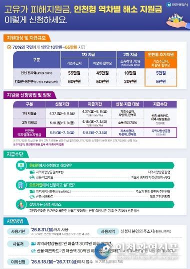이와 함께 지역 간 지원 격차를 보완하기 위한 ‘인천형 역차별 해소 지원금’ 5만 원도 5월 11일부터 취약계층을 대상으로 추가 지급될 예정이다.