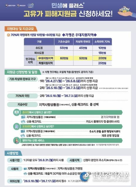 군 관계자는 “가평군은 인구감소 우대 지역으로 분류돼 지원 규모가 큰 만큼, 대상 군민들이 한 분도 빠짐없이 혜택을 받을 수 있도록 신청 안내와 현장 대응에 만전을 기하겠다”고 말했다.