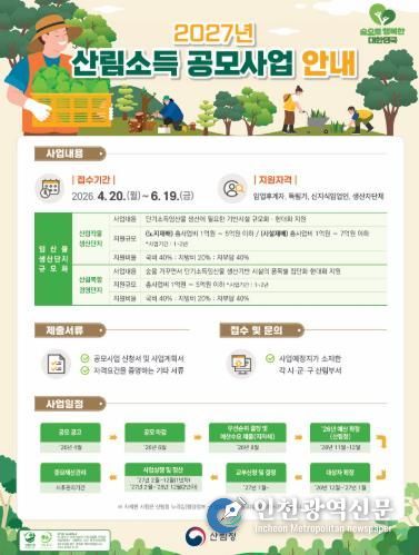 [인천광역신문] 최예준 기자 | 고흥군은 임산물 생산 기반 확충과 임업 경쟁력 강화를 위해 ‘2027년도 산림소득사업(임산물생산단지 규모화)’ 공모사업 신청을 오는 6월 19일까지 접수한다고 밝혔다.