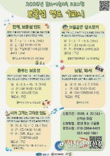 [인천광역신문] 최예준 기자 | 부산시 영도구는 지역 자원을 활용한 영도형 문화예술교육 프로그램인 ‘보물섬영도 1교시’ 참여자를 오는 5월부터 본격 운영한다.