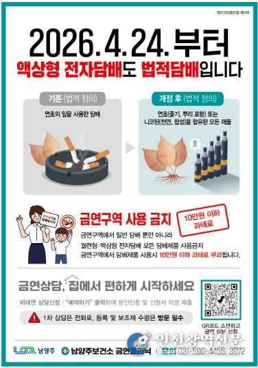 [인천광역신문] 최예준 기자 | 남양주시는 담배사업법 개정에 따라 24일부터 합성니코틴 액상형 전자담배도 법적 담배에 포함돼 금연구역에서 흡연 시 10만 원 이하의 과태료가 부과된다고 밝혔다.