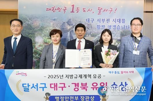 [인천광역신문] 최예준 기자 | 대구 달서구는 행정안전부 주관‘2025년 지방규제개혁 유공’평가에서 장관 표창을 수상했다고 27일 밝혔다.