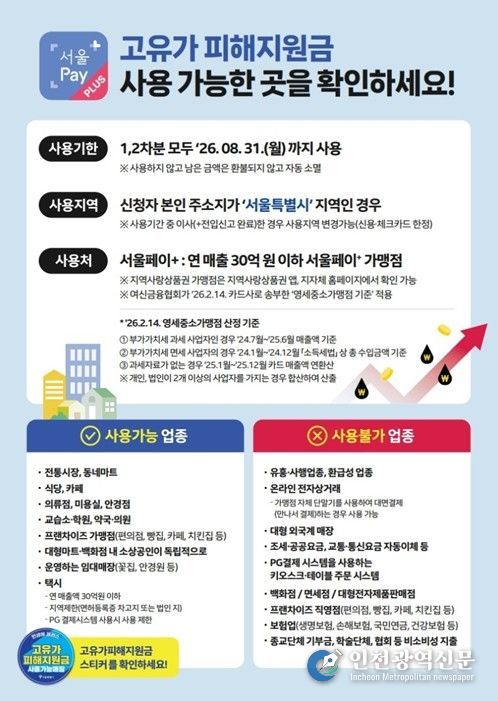 지원금은 행정안전부 지침에 따라 2026년 8월 31일까지 서울 소재 연매출 30억 원 이하 가맹점에서 사용 가능하고, 기한 내 사용하지 못한 잔액은 자동 회수된다. 또한 서울사랑상품권으로 지급된 지원금은 기존 상품권과 달리 ‘선물하기’ 기능은 제한된다.
