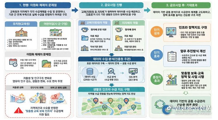 [인천광역신문] 최예준 기자 | 교육부와 한국보육진흥원(원장 조용남)은 모든 영유아가 집 근처에서 질 높은 교육·보육 서비스를 받을 수 있도록 유치원과 어린이집 수급 정보를 한 곳에서 분석·제공하는 ‘영유아 교육·보육 인프라 데이터 체계 구축 시범지역 공모’를 실시한다.