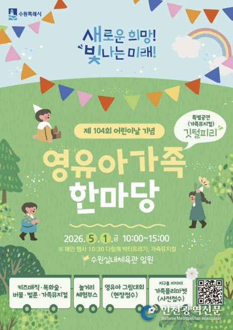 [인천광역신문] 최예준 기자 | 수원특례시는 5월 1일 10시부터 15시까지 수원체육관 일원에서 제104회 어린이날 기념 ‘영유아 가족 한마당’을 연다.
