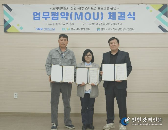[인천광역신문] 최예준 기자 | 삼척도계도시재생현장지원센터는 4월 23일 센터에서 강원대학교 도계운영본부, 사단법인 한국대학발명협회와 함께 ‘도계대학도시 청년·광부 스타트업 프로그램 운영’을 위한 업무협약(MOU)을 체결했다.