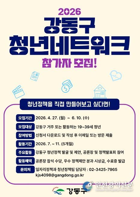 [인천광역신문] 최예준 기자 | 서울 강동구는 ‘2026년 강동구 청년네트워크’ 참여자를 모집한다고 밝혔다. 청년네트워크는 청년들이 직접 의제를 발굴하고 정책을 제안하는 사업이다.
