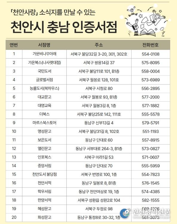 천안사랑이 비치된 서점 목록은 천안시 도서관 누리집에서 확인할 수 있다. 소식지는 카카오톡 채널 ‘천사통’과 모바일 앱으로 제공되며, 시청 누리집에서 우편 무료 구독 신청도 가능하다.