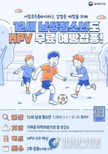 [인천광역신문] 최예준 기자 | 진주시는 질병관리청의 국가 예방접종 정책에 따라 오는 5월 6일부터 12세 남성 청소년(2014년생)까지 지원 대상을 확대해 ‘사람유두종바이러스(HPV)’ 예방접종 지원사업을 시행한다.