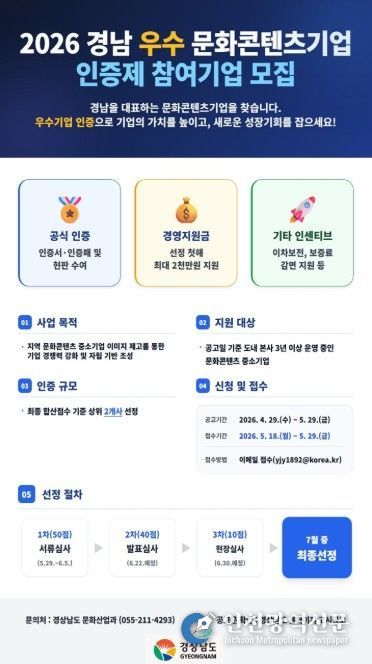 [인천광역신문] 최예준 기자 | 경상남도는 ‘2026년 경남 우수 문화콘텐츠기업 인증제’ 참여 기업을 4월 29일부터 5월 29일까지 한 달간 모집한다고 밝혔다.