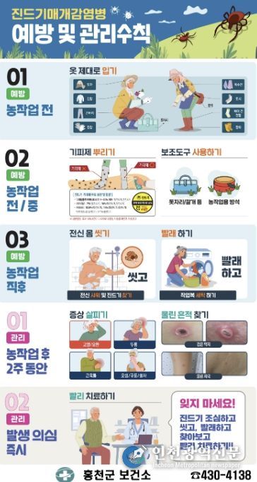 [인천광역신문] 최예준 기자 | 홍천군보건소는 최근 기온 상승으로 진드기 활동이 활발해지고, 봄철 농작업과 야외 활동이 늘어남에 따라 진드기 매개 감염병 예방 수칙을 철저히 지켜 달라고 당부했다.