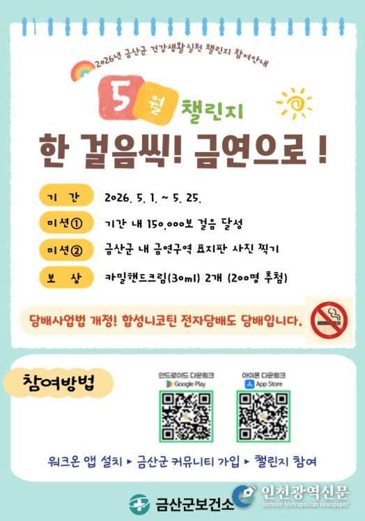 [인천광역신문] 최예준 기자 | 금산군보건소는 지역주민의 건강증진과 금연 실천 분위기 확산을 위해 오는 2026 건강생활실천 5월 챌린지 ‘한 걸음씩! 금연으로!’를 5월 1일부터 25일까지 진행한다.