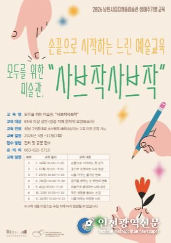 [인천광역신문] 최예준 기자 | 남원시립김병종미술관은 오는 5월부터 11월까지 실버세대를 위한 생애주기별 예술교육 프로그램 '모두를 위한 미술관, ‘사브작사브작’' 을 운영한다고 밝혔다.