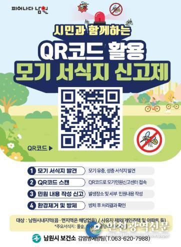 [인천광역신문] 최예준 기자 | 남원시보건소가 여름철 모기 매개 감염병 예방과 시민 편의를 위해 스마트폰 GPS 위치 정보를 활용한 'QR코드 모기 서식지 신고제'를 운영한다고 밝혔다.