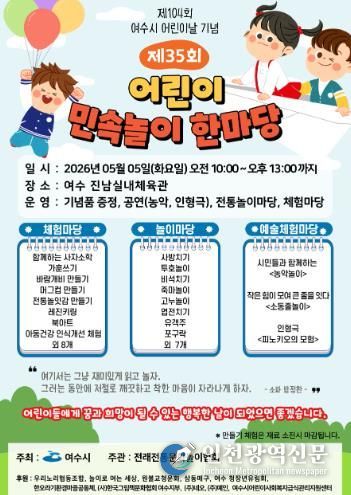 [인천광역신문] 최예준 기자 | 여수시는 제104회 어린이날을 맞아 5월 5일, 아이들이 가족과 함께 전통문화를 즐기며 마음껏 뛰놀 수 있는 민속놀이 놀이 한마당을 개최한다.