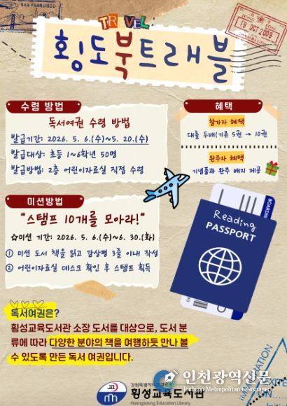 [인천광역신문] 최예준 기자 | 횡성교육도서관은 5월 6일부터 6월 30일까지 어린이들의 자발적인 독서 습관 형성과 도서관 이용 활성화를 위해 독서 여권을 활용한 ‘횡도북트래블’ 프로그램을 운영한다고 밝혔다.
