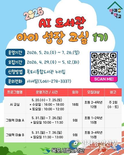 [인천광역신문] 최예준 기자 | 목포시립도서관은 관내 초등학생을 대상으로 AI 융합 체험형 프로그램 ‘AI 도서관·아이 성장 교실’을 오는 5월 20일부터 운영한다.