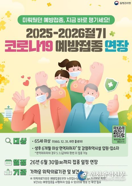 [인천광역신문] 최예준 기자 | 의정부시 보건소는 고위험군의 건강 보호와 여름철 코로나19 유행에 선제적으로 대응하기 위해 2025-2026절기 코로나19 예방접종사업 기간을 기존 4월 30일에서 6월 30일까지 두 달간 연장한다.