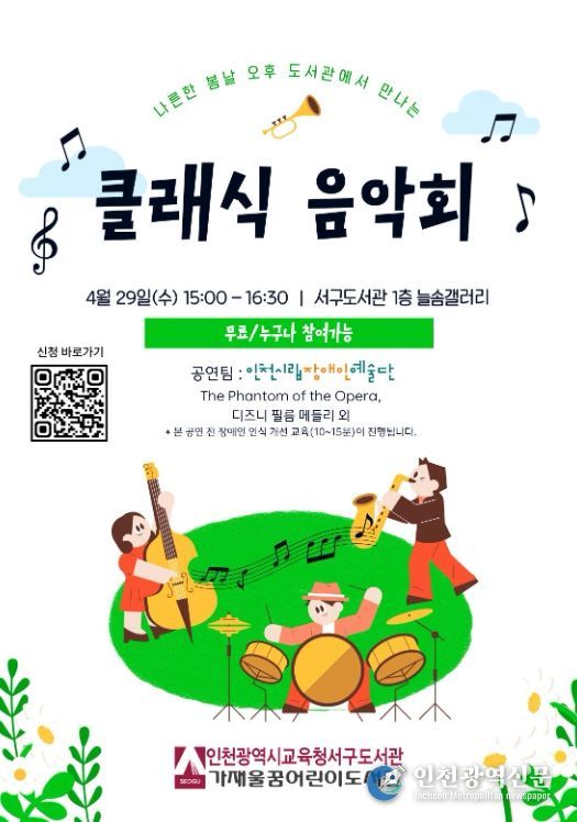 [인천광역신문] 최예준 기자 | 인천광역시교육청서구도서관은 오는 29일 오후 3시, 도서관 내 늘솜갤러리에서 지역 주민과 함께하는 ‘클래식 음악회’를 개최한다.