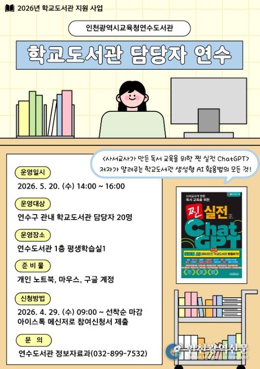 [인천광역신문] 최예준 기자 | 인천광역시교육청연수도서관은 5월 20일 학교도서관 담당자의 실무 역량을 높이기 위한 ‘학교도서관 담당자 연수’를 운영한다.