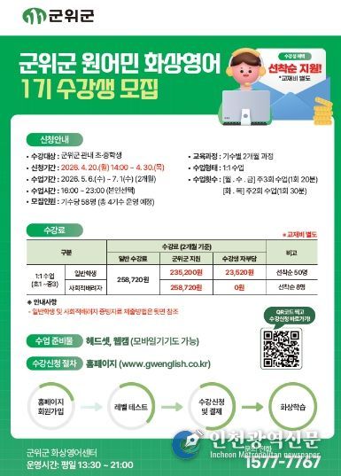 [인천광역신문] 최예준 기자 | 군위군은 관내 초·중학생의 영어 능력 향상과 사교육비 부담 완화를 위해 ‘1:1 원어민 화상영어’ 프로그램 1기 수강생을 4월 30일까지 선착순 모집한다고 밝혔다.