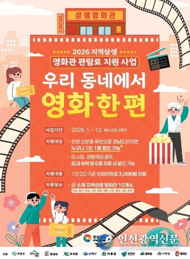 [인천광역신문] 최예준 기자 | 거창군은 다가오는 5월 가정의 달을 맞이해 군민들의 문화 향유 기회를 확대하고 지역 영화관의 활성화를 돕기 위해 ‘2026년 지역상생 영화관 관람료 지원사업’을 시행한다.