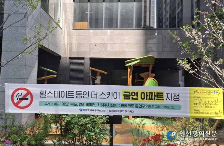 [인천광역신문] 최예준 기자 | 대구 중구는 공동생활공간에서 발생하는 간접흡연 피해로부터 주민을 보호하고 쾌적한 금연 환경을 조성하기 위해 ‘힐스테이트 달성공원역’(중구 태평로 41)과 ‘힐스테이트 동인 더 스카이’(중구 태평로 240)를 각각 제26호, 제27호 공동주택 금연구역으로 지정했다.