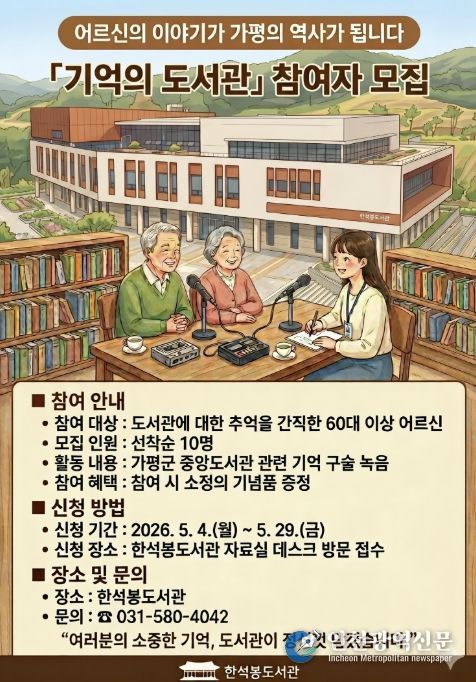 [인천광역신문] 최예준 기자 | 가평군 한석봉도서관이 오는 5월부터 어르신들의 생생한 목소리로 지역의 옛 기록을 수집하는 ‘기억의 도서관’ 프로그램을 운영한다. 실버층 특화 사업인 ‘말랑말랑 추억 교실’의 일환으로 추진되는 이번 사업은 지역 문화 자산을 확보하고 세대 간 기억을 공유하고자 기획됐다.