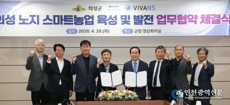 [인천광역신문] 최예준 기자 | 의성군은 28일 군청 영상회의실에서 스마트농업 솔루션 전문기업 ㈜비바엔에스(대표이사 김영식)와 ‘노지 스마트농업 육성 및 발전을 위한 업무협약(MOU)’을 체결했다고 밝혔다.