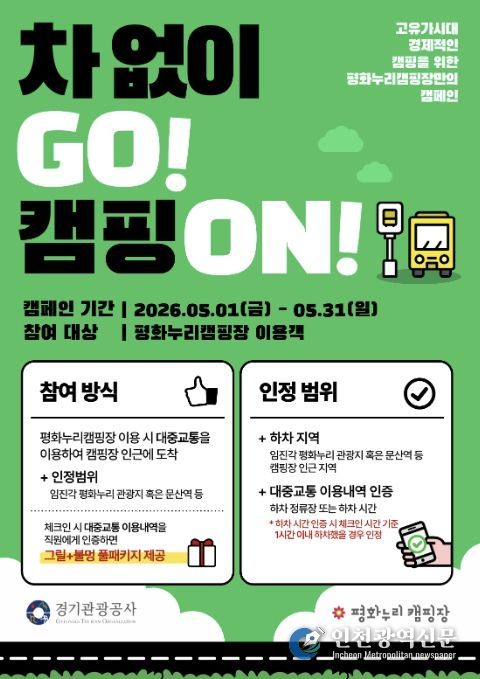 ‘차 없이 GO, 캠핑 ON’는 대중교통을 이용해 캠핑장을 방문하는 고객에게 혜택을 제공하는 캠페인이다. 대중교통 이용 내역을 인증하면 참여할 수 있으며, 참여 고객에게는 그릴과 불멍을 동시에 즐길 수 있는 ‘그릴+불멍 풀패키지’(48,000원 상당) 상품이 제공된다. 대중교통 이용 인정 범위는 문산역 또는 임진각 평화누리 관광지 일원 하차를 기준으로 하며, 이후 캠핑장까지는 도보 또는 택시 이용이 허용된다. 자세한 사항은 평화누리캠핑장 누리집을 통해 확인할 수 있다.