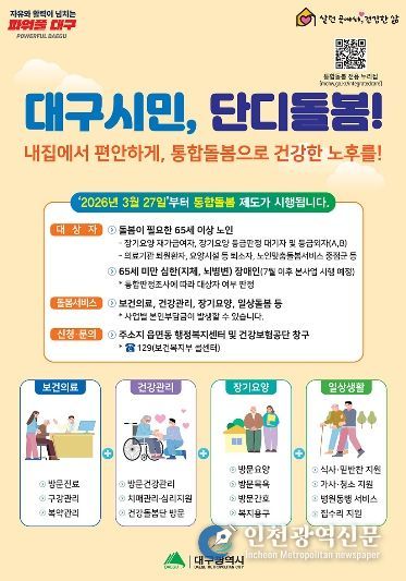 [인천광역신문] 최예준 기자 | 대구광역시는 지난 3월 27일 '돌봄통합지원법' 시행에 따라 추진 중인 대구형 통합돌봄 ‘단디돌봄’이 시행 한 달을 맞아 신청 접수부터 서비스 연계까지 현장에 안정적으로 정착하고 있다고 밝혔다.