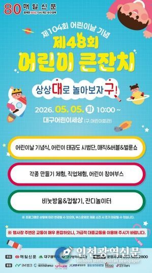 [인천광역신문] 최예준 기자 | 대구광역시는 제104회 어린이날을 맞아 어린이와 온 가족이 함께 즐길 수 있는 풍성한 문화·체험 행사를 시 전역에서 개최한다.
