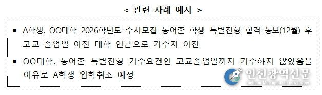 [인천광역신문] 최예준 기자 | 교육부는 ‘농어촌 학생 특별전형’ 자격요건과 관련하여 대입현장에서 반복적으로 발생하는 불합리한 사례를 해소하기 위한 적극행정조치 및 제도개선을 시행할 계획이라고 밝혔다.
