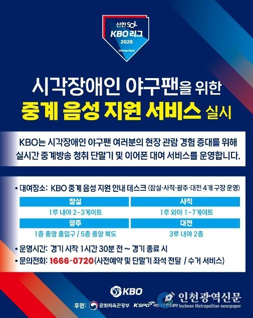 [인천광역신문] 최예준 기자 | KBO는 2023년부터 잠실, 사직, 광주 구장에서 운영해 온 ‘KBO 리그 시각장애인 현장 관람객 대상 중계 음성 지원 서비스’를 올해 대전 한화생명 볼파크까지 확대해 총 4개 구장에서 운영한다.