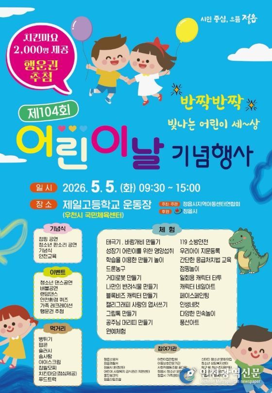 [인천광역신문] 최예준 기자 | 정읍시는 다가오는 제104회 어린이날을 맞아 오는 5월 5일 정읍제일고등학교 운동장(우천 시 국민체육센터)에서 어린이날 기념행사를 개최한다.