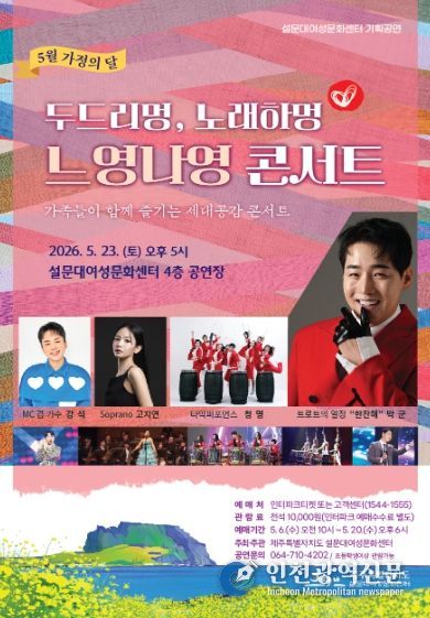 [인천광역신문] 최예준 기자 | 제주특별자치도 설문대여성문화센터는 오는 5월 23일 오후 5시 센터 4층 공연장에서 ‘설문대 문화의 날’ 5월 기획공연으로 '두드리멍 노래하멍 느영나영 콘서트'를 개최한다고 밝혔다.