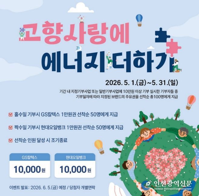 [인천광역신문] 최예준 기자 | 원주시는 고향사랑기부제 활성화를 위해 5월 한 달간 특별 이벤트 ‘고향사랑에 에너지 더하기’를 추진한다.